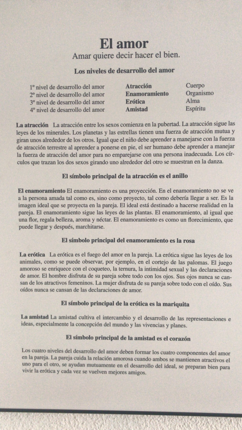 Comenzó a bajar Castellana tratando de fijar en su conciencia el concepto de amor, buscando concretar una representación, una imagen que le hiciera justicia. Se le apareció la escena de «Las amistades peligrosas» en la que el Vizconde de Valmont (John Malcovich) deja a Madame de Tourvel (Michelle Pfeiffer), repitiendo mil veces la expresión «no puedo evitarlo». En la plaza de Cuzco una imagen de su infancia apareció nítida: debía tener 7 años e iba sentado en un autocar con otros 50 niños de un campamento de verano. Había conseguido un lugar delante de una niña bellísima que debía de 11 o 12 que le generaba una atracción increíble. Recordó que ese instante fue la primera vez que sintió amor, al menos al nivel del cuerpo, el de la atracción de la materia. A la altura de Nuevos Ministerios observó la fachada de El Corte Inglés con una gran foto de Gisele Bündchen en bikini y un pensamiento de fuera entró por el casco diciéndole que se dejara de tonterías, que esa era la representación del amor que andaba buscando. Por suerte, la bocina del coche de detrás le devolvió al proceso de búsqueda interior.